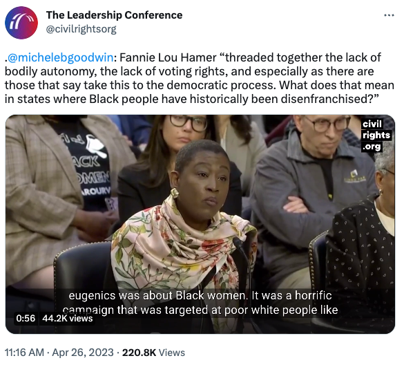Repro Legal Scholar Michele Goodwin testified before the Senate Judiciary Committee this week, edifying the body on the history of eugenics in the U.S., the legacy of Fannie Lou Hamer, and the ways in which attacks on Black women’s reproductive autonomy, voting rights, and other civil rights and freedoms are all interconnected. Her full testimony is available for download here, but the Leadership Conference tweeted a video excerpt: