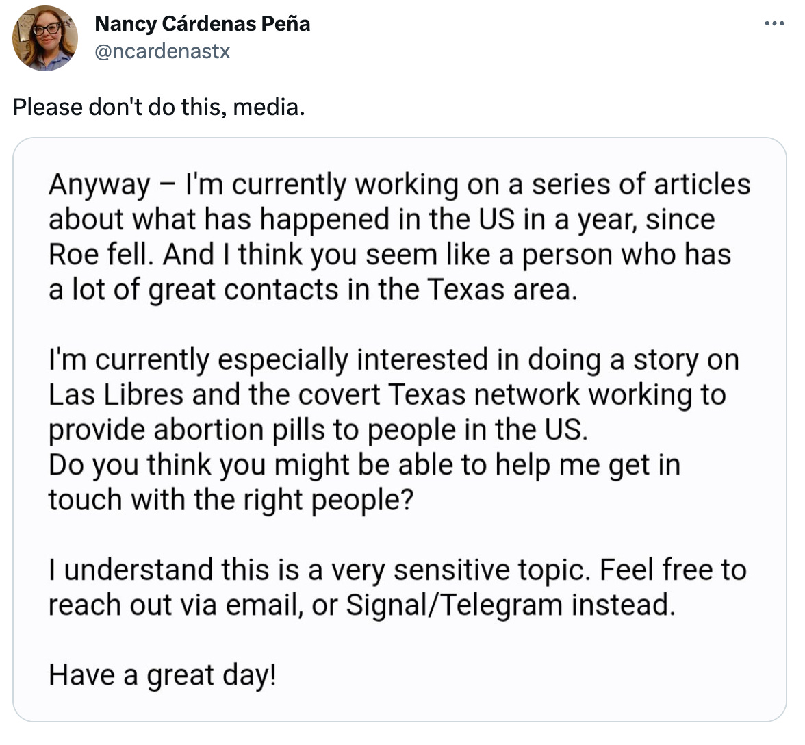 The National Latina Institute for Reproductive Justice’s Nancy Cárdenas Peña tweets an example from her own inbox of what not to do when reporting on abortion: