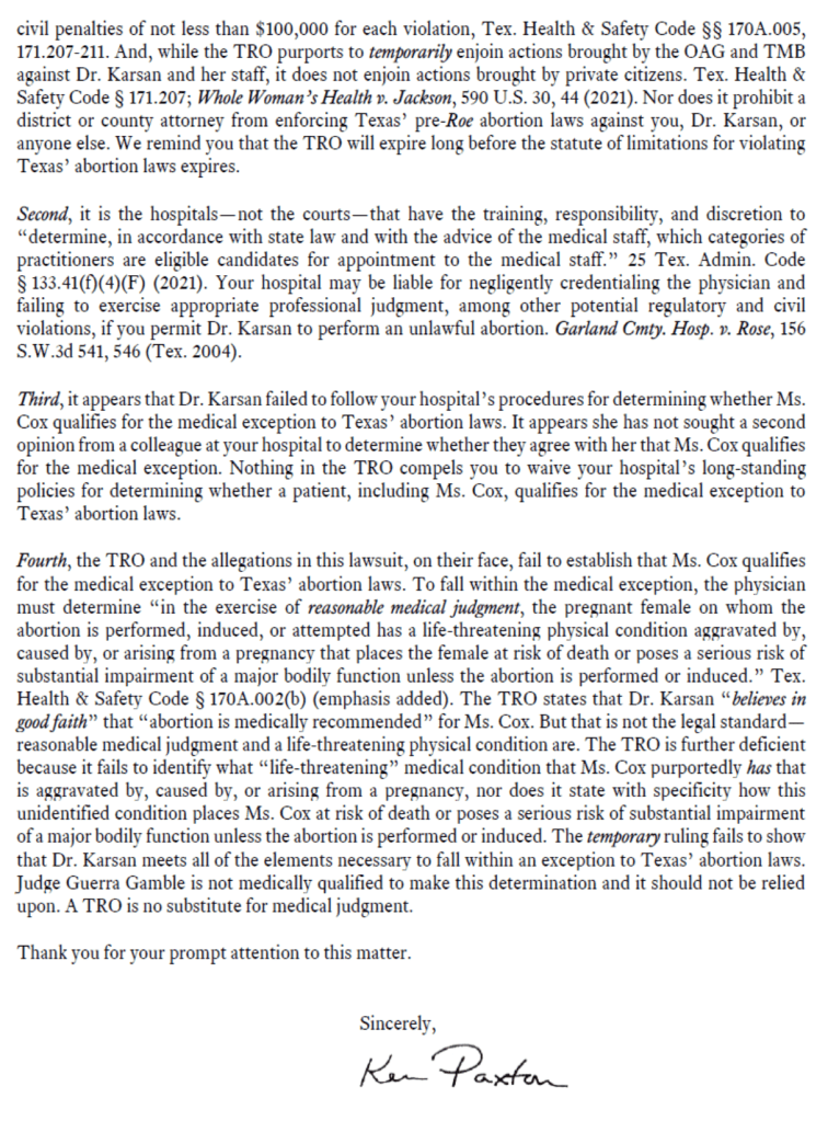 I want to highlight a particularly rich line from Paxton’s odious, self-aggrandizing letter of threat: “A TRO is no substitute for medical judgment.”