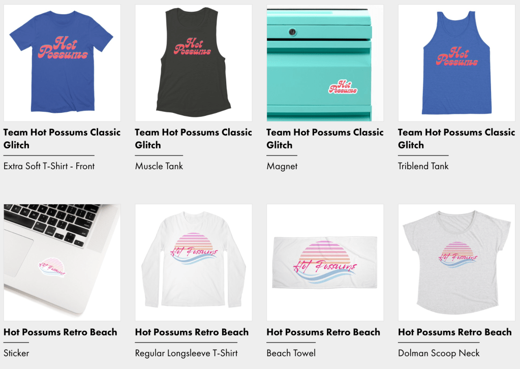 The designs y’all see here are just a few cherry-picked items that I think look particularly fun; if you head to the store itself, there are a million ways to customize the designs you like best, in the format that seems most amenable to your obviously very urgent needs. (My husband got a Hot Possums Retro Beach design magnet for his ’95 F-150, which I think extremely tracks.)
