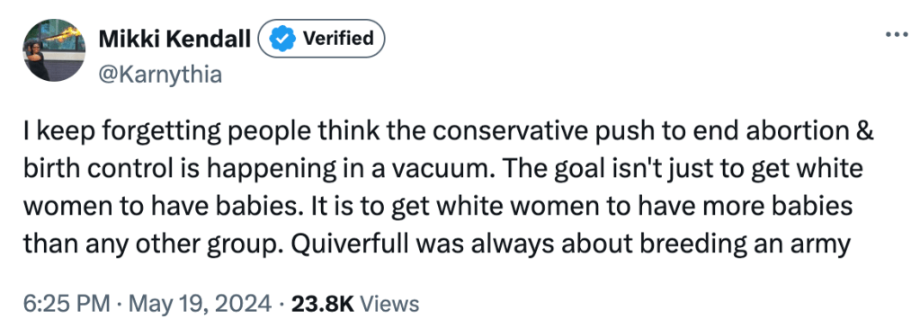 Author Mikki Kendalltweets a word on the goals of the anti-abortion/forced birth movements: