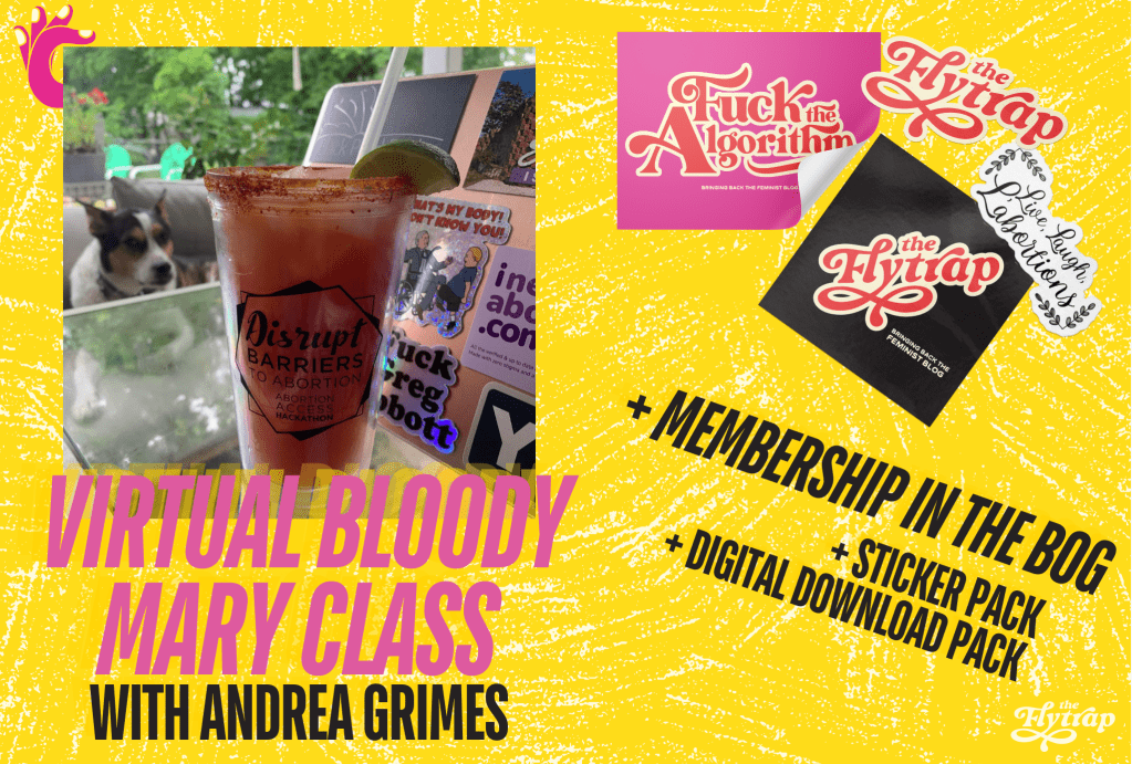 Oh, and: We’ve got a few spots left in my BLOODIES IN THE BOG tier for folks who want to kick in $420 to be part of indie feminist media history by getting a personal Bloody Mary mixology + cocktail history class with yours truly.
